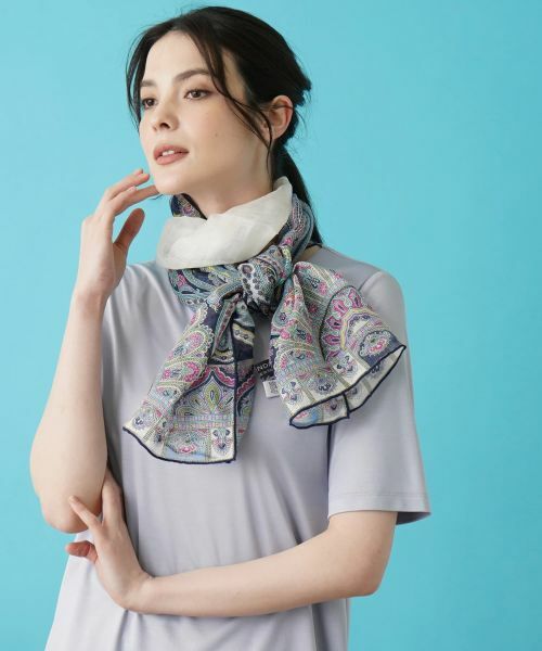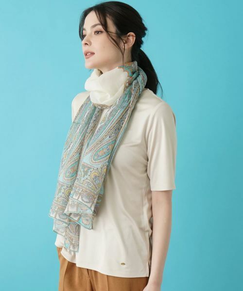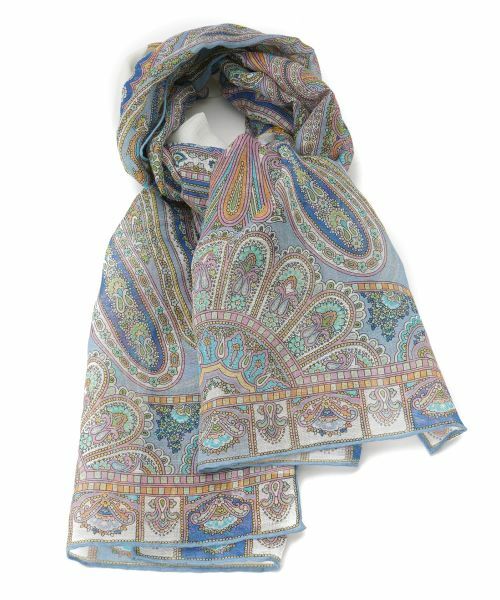 繊細な模様をカラフルな色調で描いたロングストール。麻を思わせるさらりとした風合いと、滑らかな光沢を持つ上質な繊維をブレンドした軽やかな生地感も美しく、春夏コーディネートのポイントになってくれるアイテムです。無地のカットソーに添えるだけで、華やかな印象になります。家庭洗濯不可漂白不可タンブル乾燥不可アイロン低温160℃まで石油系溶剤ドライクリーニング弱ウェットクリーニング不可