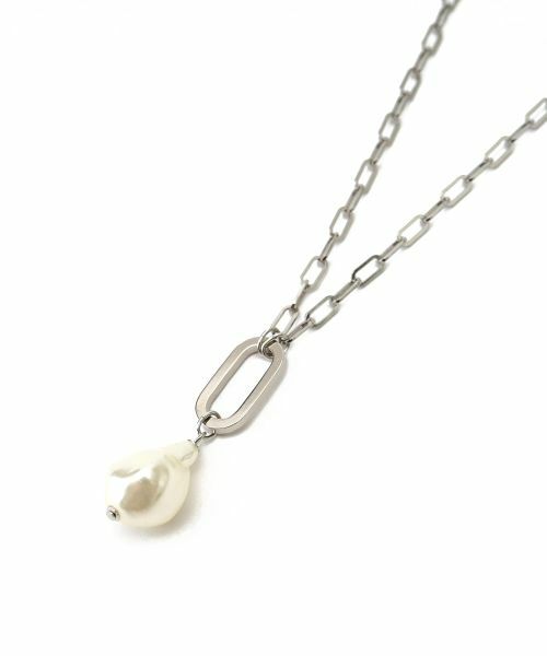 大きめのチェーンまでデザインが行き届いたネックレスは、雫のような一粒のパール調パーツが存在感を放つ、モードなデザイン。麻を思わせるさらりとした風合いや綿など、天然素材風のトップスが多くなる季節に、モダンな輝きがアクセントになります。縦長のラインで首元をすっきりと見せてくれるのも嬉しいポイントです。