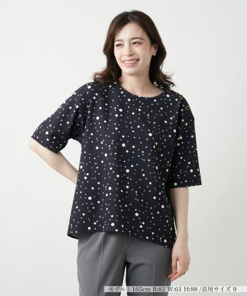 ユニークなドット柄を散りばめた、遊び心と上品さを兼ね備えたブラウスです。肩のラインを落としたドロップショルダーが、ほどよくリラックスした雰囲気を演出し、抜け感のあるシルエットに仕上がっています。左肩にはボタンを配しており、着脱のしやすさにも配慮されています。さらりとした肌ざわりの生地にはUV加工が施されており、日差しが気になる季節にも安心して着用できるトップスです。