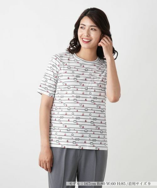 ヨットやロープが織りなすマリン柄が、ひと目で季節感を語るTシャツ。細部までこだわったプリントは遊び心がありながらも、大人に似合う洗練された雰囲気を演出します。爽やかな風合いのコットン生地仕立てで着こなしやすく、ネックラインはすっきりと詰まりすぎず、デコルテを美しく見せる絶妙なバランス。裾はわずかに前後差をつけて、軽やかな動きをプラスし、横から見たときの立体感にもひと工夫凝らしています。