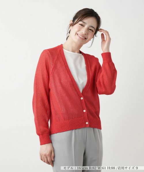 ほんのりと肌が透ける繊細な編地が、着こなしに涼やかな抜け感を与えるVネックカーディガン。空気を含むような軽やかなニット素材は、見た目にも着心地にもやさしさを感じさせます。フロントボタン仕様で、さっと羽織るだけで清潔感のあるレイヤードスタイルが完成。ミニマルなデザインで気軽にコーディネートしやすく、少し肌寒さを感じる季節の変わり目にも頼れるデイリー使いにぴったりのアイテムです。
