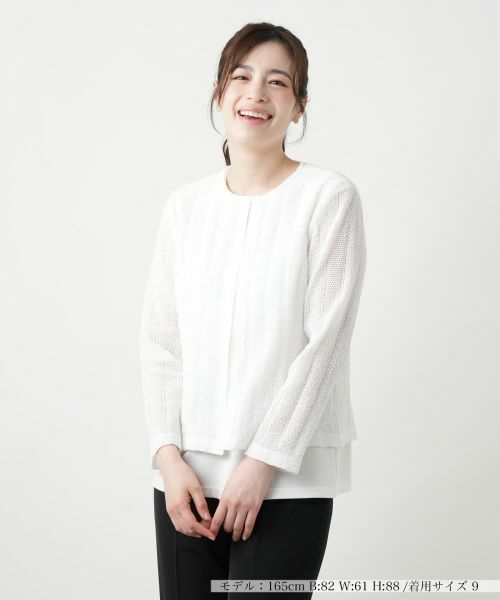 繊細な透かし編みを縦に施し、すっきりとした印象に仕上げたニットジャケット。程よい肉感と軽やかさを兼ね備えており、軽く羽織るのに便利。肌寒さを感じる季節の端境期にも心強い存在です。シンプルながらも洒落感のある編み柄が、着こなしに奥行きをプラス。フロントは鍵ホック仕様で、きちんと感と着脱のしやすさを両立。オフィスでのスタイリングはもちろん、デイリーのきれいめカジュアルにも馴染むアイテムです。