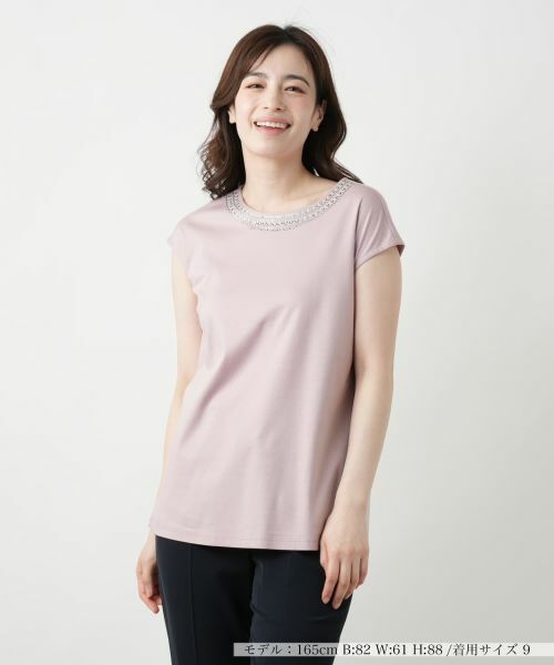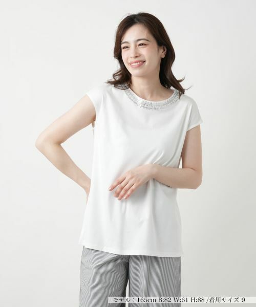 ネックまわりに繊細な刺繍とスパンコール、ビーズを贅沢にあしらった、華やかさのあるフレンチスリーブカットソーです。デコルテに沿って光を受けてきらめく装飾が、シンプルなシルエットに上品なアクセントを添えてくれます。さらりとした肌ざわりのコットン生地を使用し、これからの暑いシーズンでも快適な着心地を実現しています。バックスタイルにはボタンループ仕様の涙あきが施され、着脱もスムーズです。