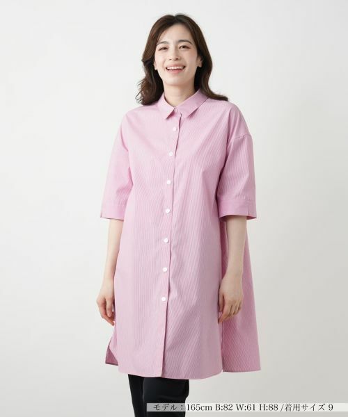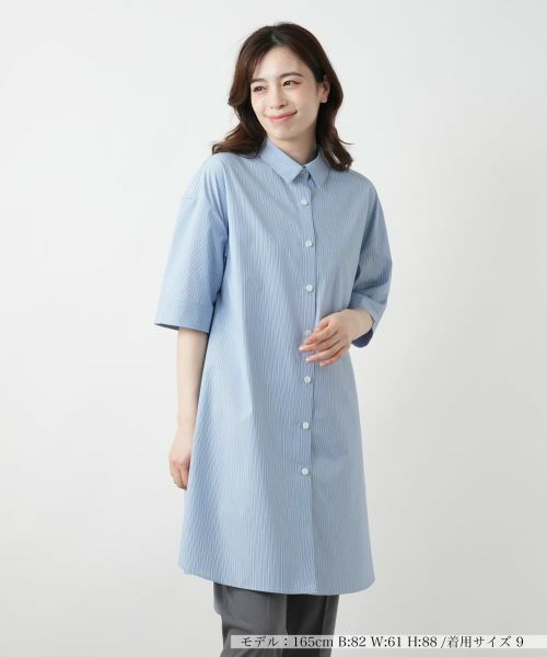 軽やかさと清涼感をまとった、ピンストライプのチュニックブラウス。程よくゆとりのあるシルエットで、自然に体形をカバーしながらすっきりと見せてくれる一枚です。裾と袖口に入ったサイドスリットがさりげないアクセントとなり、抜け感のある着こなしを後押しします。パンツにもスカートにも品よくマッチし、きちんと感のあるスタイルにも好相性。オンにもオフにもフレキシブルに頼れるアイテムです。