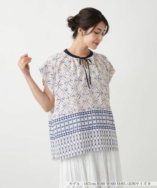 繊細な幾何学調のフラワー柄がちりばめられた、軽やかなフレンチスリーブブラウス。配色のネックやリボンがさりげなく存在感を放ち、顔まわりを引き締めつつもシックな華やかさを演出します。肩のラインをなだらかに見せるスリーブに加え、すっきりと抜け感を添えるサイドスリットがポイント。ふんわりとしたシルエットでリラックス感がありながら、上品なムードも備えた注目度の高いアイテムです。