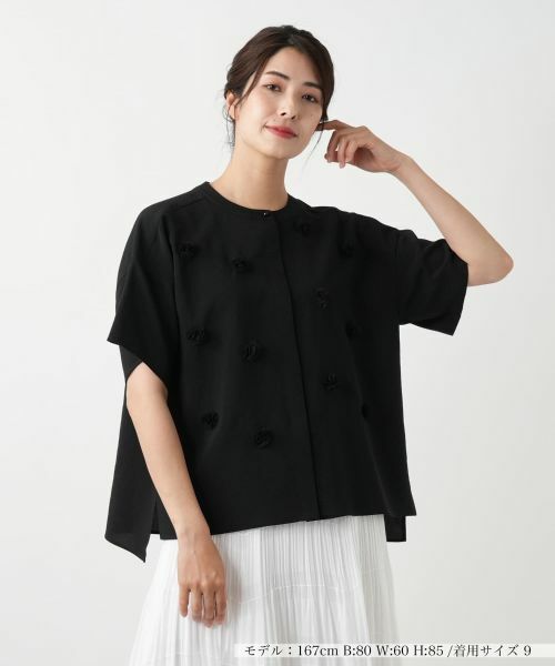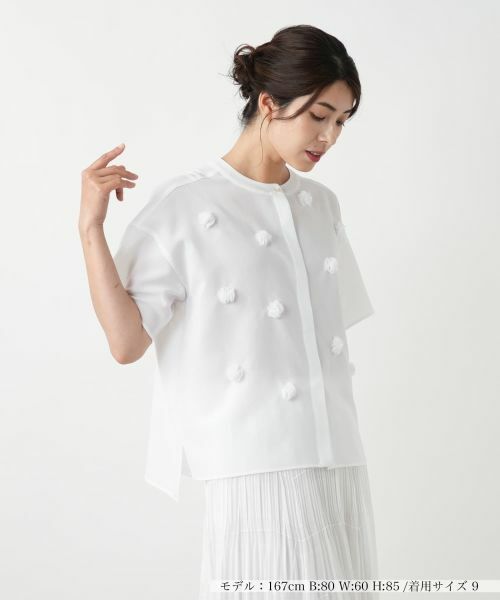 立体的なフラワーモチーフを散りばめた、可憐なアクセントが印象的なブラウス。やや肩を落としたドロップショルダーが、これからの季節らしい抜け感のあるシルエットを演出します。前立てはすっきりとした比翼仕立てで、ディテールに上品さをプラス。前後差のある裾とサイドスリットが軽やかな動きを生み、パンツにもスカートにも合わせやすく、フレキシブルに使えるアイテムです。