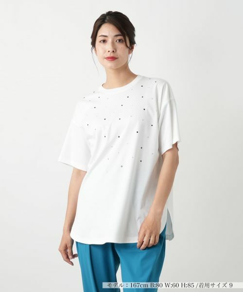 フロントにホットフィットのビジューを散りばめた、さりげない華やかさを感じさせるTシャツ。ドロップショルダーとややゆとりのあるシルエットで、リラックス感のある着心地に仕上げています。裾はラウンドカットでわずかに前後差をつけているため、ボトムとのバランスを取りやすく、コーディネートに自然な抜け感を演出します。一枚での着こなしはもちろん、ジャケットやカーディガンのインナーにも重宝するアイテムです。