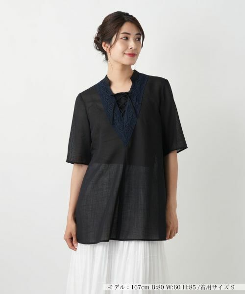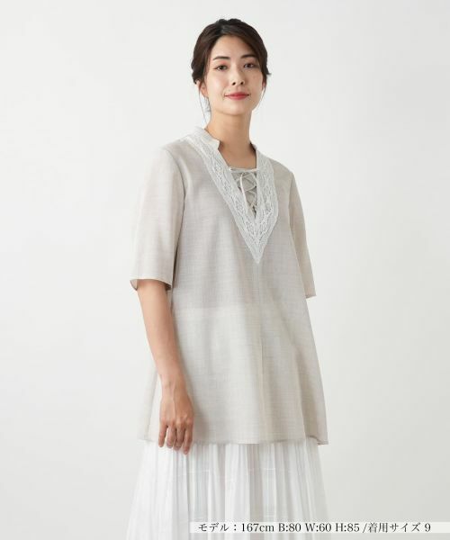 アンティーク調の繊細なレース使いがポイントになった、軽やかな素材感のチュニックブラウス。ネックラインに沿ってあしらわれたV字のレースとリボンが顔まわりを華やかに演出します。落ち感のある素材とゆったりとしたシルエットで身体のラインを拾いにくく、ヒップをナチュラルにカバーするような丈感はパンツにもスカートにも好相性。一枚で着映える、女性らしさと抜け感を兼ね備えたアイテムです。