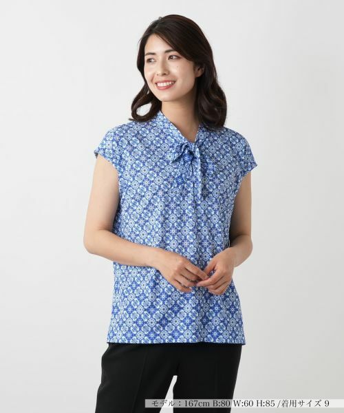 オリエンタル調の幾何学模様をあしらったフレンチスリーブのボウタイブラウス。首元にさりげなく結ばれたボウタイが、顔まわりに上品な華やかさを添えるエッセンスに。ほどよいゆとりのあるシルエットと軽やかな袖丈で、涼やかさとフェミニンなムードが感じられる一枚です。シンプルなボトムと合わせるだけで、スタイリングに奥行きを生み、ひと味違った着こなしが完成します。フロントはループボタンにより開閉が可能。