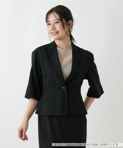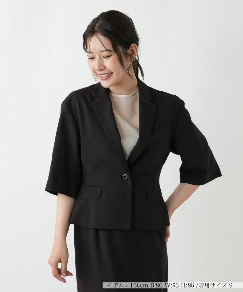 こなれた雰囲気のコーディネートが叶う五分袖ジャケット。ウエストを程よくシェイプしたコンパクトなシルエットが、女性らしいラインを演出し、スタイルアップを後押しします。すっきりとした1つボタンのデザインで、洗練された印象に仕上げました。ジャケットのきちんと感はそのままに、手首が覗く袖丈でカーディガンのような軽やかさと抜け感をプラス。オフィスルックにはもちろん、週末の外出からオケージョンまで幅広いシーンに対応しそうです。