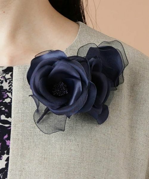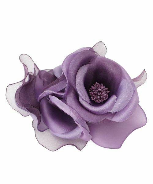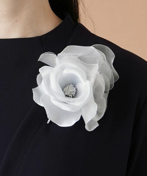 絶妙な透け感のある花びらが優雅に重なるコサージュ。適度なボリューム感で華美になりすぎず、上品に付けられます。セレモニースタイルなどにぴったり。ジャケットの襟やストール、帽子などに付けるのもおすすめです。