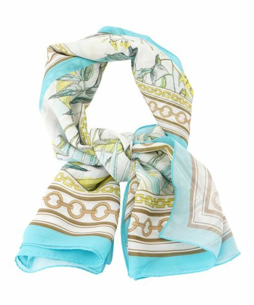 軽やかなリーフモチーフと美しいカラーの縁取りが目を惹くスカーフ。繊細なラインで描かれたモチーフに、ゴールドチェーンのディテールを重ねた、クラシックとフレッシュさが心地よく調和するデザインの一枚。素材は薄手のシルク生地でやわらかく艶やかな質感が肌になじみ、首元にふわりと巻くだけで洗練された佇まいに。肩にさらりと掛けたり、ヘアアレンジに取り入れたり、バッグのハンドルに結んだりと、自由なスタイリングが楽しめるのも魅力です。