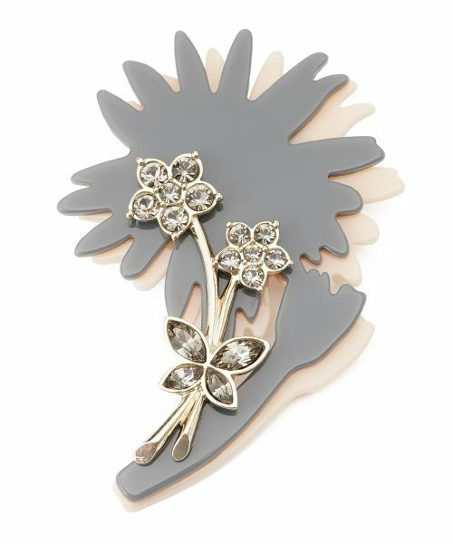 バイカラーで仕上げた花モチーフの樹脂プレートに、きらめくストーン調パーツをあしらった金属調の花モチーフを重ねたブローチ。立体感のあるデザインは、単色などの無地の編み地のトップスやジャケットを品良く引き立ててくれるでしょう。