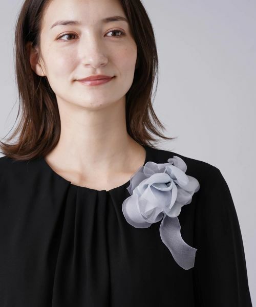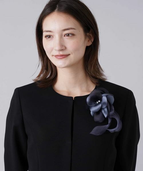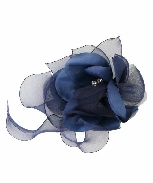 滑らかな光沢を持つ上質な繊維をブレンドした軽やかな風合いが美しい、花のコサージュ。きらめく装飾パーツを中央にあしらった、上品さが際立つデザイン。特別な日やパーティーシーンなどに取り入れたいアイテムです。
