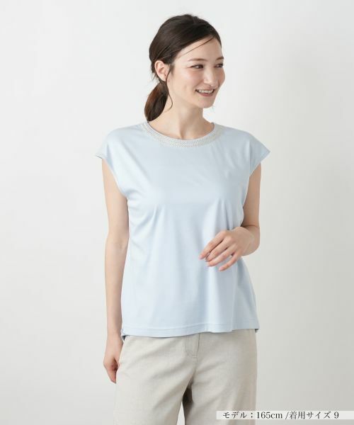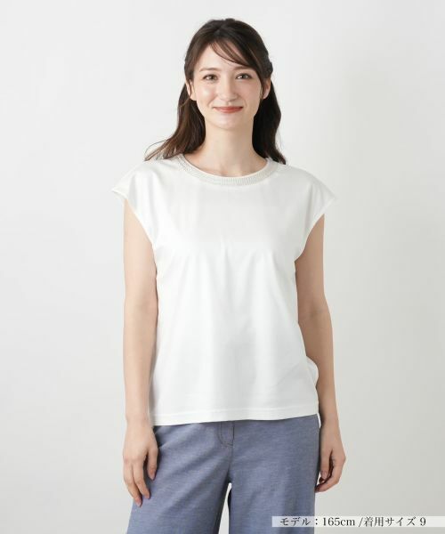 ネックラインにあしらった繊細な刺繍が、さりげない華やかさを添えるプルオーバー。肩先までを自然に覆うフレンチスリーブは、気になる腕まわりをカバーしつつ、涼しげな印象を与えてくれます。裾サイドにはループボタンを施し、さりげないアクセントに。伸縮性のあるやや薄手の生地は、肌離れも良く快適な着心地です。ベーシックなシルエットでありながら、細部にこだわったディテールが上品さを演出。パンツともスカートとも合わせやすく、日常使いからオフィスシーンまで幅広く活躍する一枚です。