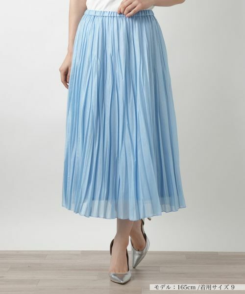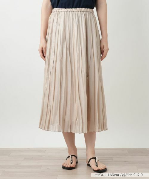 繊細なプリーツが美しく揺れる、エアリーな素材感のロングスカート。ほんのりと光沢を帯びた表面感が、上品で涼やかな印象を演出します。広がりすぎないシルエットで、縦ラインを強調しながらすっきりとした着こなしが可能。ウエストはゴム仕様で、見た目のきちんと感と快適な着用感を両立しています。軽やかでやや薄手の素材は、真夏のお出かけや旅行にもぴったり。シンプルなトップスと合わせるだけで華やかさが生まれ、オンオフ問わず活躍する一枚です。