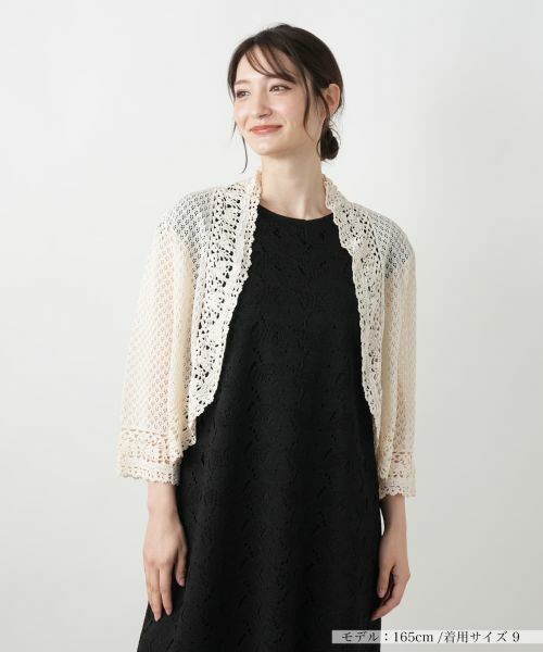 繊細なかぎ編みレースにビーズをあしらった、軽やかで華やかなカーディガン。程よい透け感が涼しげな印象を与え、夏の装いに上品さをプラスします。伸縮性のある柔らかな編地は、肩からふんわりと包み込むような着心地で、軽やかさと動きやすさを兼ね備えています。七分袖のバランスが腕まわりをすっきりと見せ、冷房対策や日除けとしても活躍。ワンピースやノースリーブのトップスに重ねるだけで、コーディネート全体をクラスアップしてくれるアイテムです。