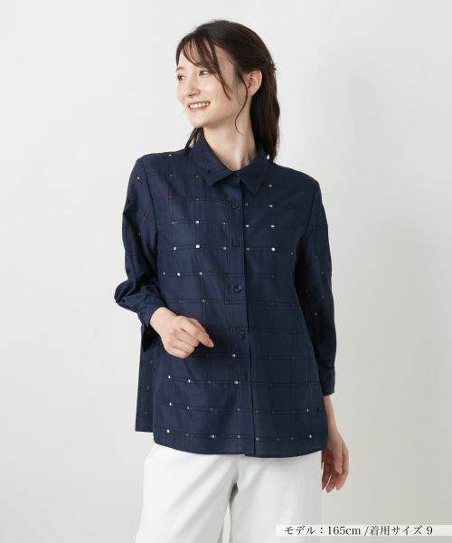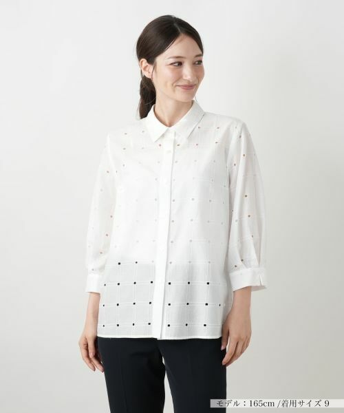 繊細なカットワークを全体にあしらった、上品な印象の七分袖のブラウス。程よい透け感と清涼感のある素材で、夏のお出かけや日常使いにぴったりの一枚です。スタンダードなシャツカラーがきちんと感を演出しつつ、控えめな装飾が大人らしい洗練された表情をプラス。やや薄手のコットン素材で涼しく、肌離れの良い快適な着心地も魅力です。裾に向かって広がる自然なシルエットが体型を拾いにくく、リラックスして着られるのもポイント。ボトムを選ばず合わせやすく、コーディネートの幅を広げてくれる一枚です。