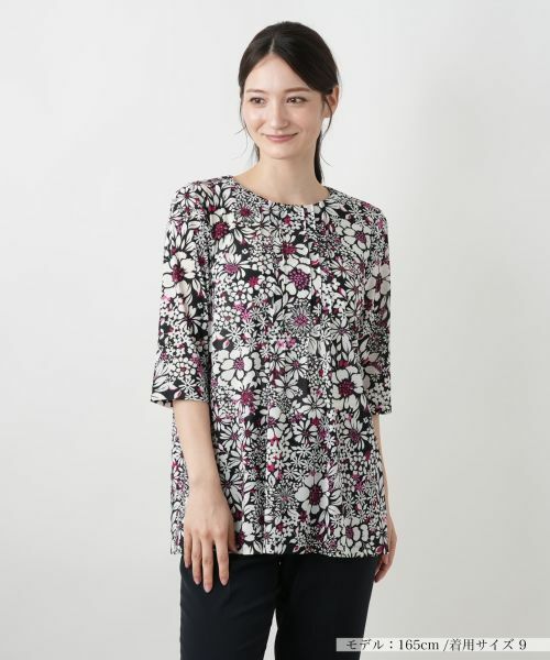 華やかな花柄が印象的なカットソー。軽やかなパワーネット素材を使用し、通気性がありながらも程よいフィット感で快適な着心地を実現しています。フロントにはタックを入れ立体感のある表情に。後ろボタン開閉仕様で、着脱もスムーズ。身体のラインを拾いにくいシルエット設計で、気になる部分をさりげなくカバーしながら、すっきりとした印象に。やや長めの着丈はパンツとも好相性で、デイリーからお出かけまで活躍します。