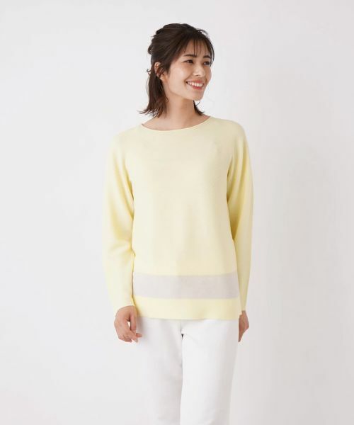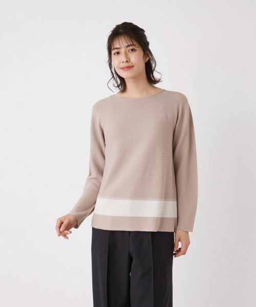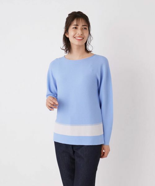 ウエスト周りに存在感たっぷりのボールドラインでアクセントを効かせた、ラウンドネックニットプルオーバー。ウエスト周りのラインには部分的にラメ糸を使用し、ほんのりとリュクス感を漂わせました。ネック周りはすっきりと開き、絶妙なバランスの抜け感をプラス。すっきりとしたシルエットでボトムスともバランスよくコーディネートできるアイテムです。