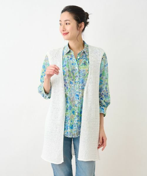 さらりと羽織る1つボタン仕様のニットジレ。ローゲージのバスケット編みで初夏に向けてもおすすめの一枚です。肩の切り替え部分は縫い目が目立たないよう、編み方に隠れたテクニックが施されております。柄物ブラウスとのレイヤードも絶妙なバランスで仕上がり、上級者らしいオシャレが楽しめます。