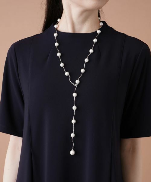 ウェーブを描くような金属調チェーンと、ふんわりとした輝きのパール調パーツが、品良く可憐に調和したラリエット。華やかすぎないデザインで日常のスタイリングにも取り入れやすく、シンプルなブラウスやワンピースのアクセントにも適しています。
