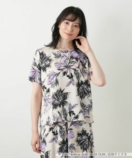 手描き風の花柄プリントがインパクトを放つ、クルーネックブラウス。さらりとした落ち感のある素材が作り出すドレープが、動きに合わせて空気をはらみ、女性らしいしなやかさを引き立てます。後ろ姿はボタンループの開きをあしらい、ほんのりと抜け感を演出。同柄のスカートと合わせれば、セットアップとして上品にまとまり、単品でもデニムやワイドパンツと好相性。日常にもお出かけにも映える、華やぎとリラクシーを両立したトップスです。