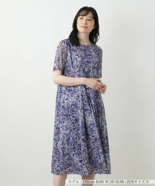 小花柄のプリントに、フロントのタックが繊細な陰影を添えるフレアワンピース。裾に向かってナチュラルに広がるラインが軽やかな美しさを引き立てます。さらりとした素材感で見た目の華やかさに対して着心地はスムーズ。背中はボタンループ開きで着脱もさりげなく女性らしい仕上がりに。一枚でさらりと着こなしても、アクセサリーや羽織りを添えても、日常からお出かけまで気分を華やかにしてくれるアイテムです。