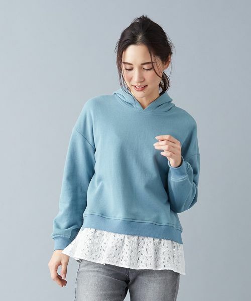 裏毛素材とレースをMIXしたカジュアルフーディー。シンプルなフーディーの裾にレースを付けてアクセントにしました。首元がすっきり見えるよう、フードはあえて小さめに作っています。ウォッシャブル対応※定価(税込)は、2021年05月28日のセール開始前の店舗における販売価格です。手洗い可酸素系漂白可タンブル乾燥不可つり干し(日陰)アイロン低温160℃までドライクリーニング可ウェットクリーニング(弱い処理)