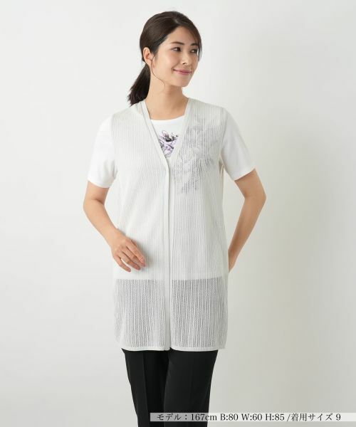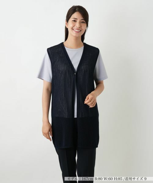 ほどよい透け感があり軽やかな印象を生み出す、ニットベスト。コットンの柔らかさに、ポリエステルをミックスすることで清涼感のある編地に仕上げました。縦ラインを強調するすっきりとしたシルエットで、カットソーやブラウスの上からさっと羽織るだけでスタイルアップ見せ効果も。Tシャツやブラウスに重ねるだけで、奥行きのあるレイヤードコーデが完成します。季節の変わり目にも重宝する、上品さと軽快さを両立したアイテムです。