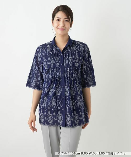 アンティーク調の繊細なフラワー刺繍をあしらい、華やかさと涼感を兼ね備えたブラウス。裾と袖口にはスカラップカットを施し、やさしく波打つラインが上品なアクセントに。フロントに入れた細やかなピンタックが縦のラインを強調し、すっきりとした印象をプラス。シルエットには程よくゆとりをもたせ、リラクシーな着心地を叶えました。軽やかな薄手のコットン素材で通気性もよく、涼やかで女性らしいトップスです。