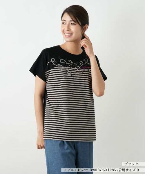 シンプルなボーダーと無地を切り替えた印象的なデザインに、刺?とスパンコールをあしらった華やかなカットソー。ロープモチーフと刺?が前身頃を彩り、カジュアルながらも女性らしいディテールが光ります。柔らかなコットン素材が心地よく、一枚で着映えする主役トップスとしてデイリーに活躍してくれそう。軽やかにジャストシーズンのマリンテイストを楽しめる注目のトップスです。