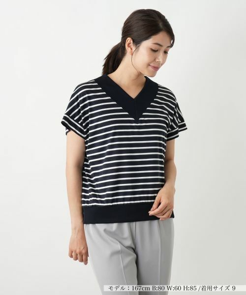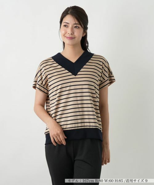 クラシックなボーダーに、無地のVネックやヘムラインを切り替えてモダンな表情をプラスしたカットソー。シャープなネックラインがデコルテをきれいに引き立てます。肩まわりをやさしく包むようなゆとりのあるシルエットと、裾の心地よいフィットで自然な立体感を生み出します。ヒップにかかる丈感はパンツともスカートとも好相性。一枚で着映えしながらも、日常に溶け込むバランスのよさが魅力です。