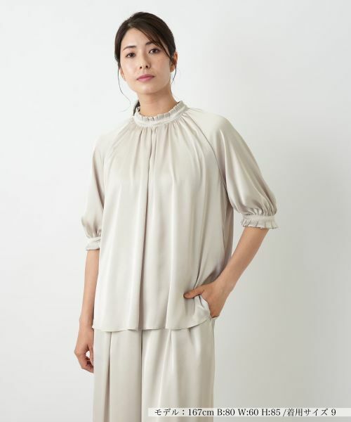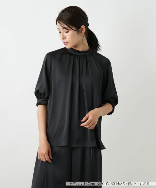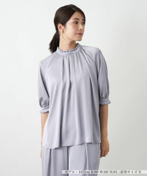 ネックラインと袖口にあしらわれたフリルがやさしく揺れて、上品な華やかさを引き立てるハイネックブラウス。首元はコンパクトに、身頃はタックとギャザーで程よくふくらみを持たせ、立体感のあるシルエットに仕上げています。しなやかな素材の落ち感が動きを美しく見せてくれるのもポイント。ラグランスリーブ仕様で肩まわりの締めつけがなく、腕を動かしやすいストレスフリーな着心地を実現します。バックネックの涙あきはボタンにより開閉が可能です。