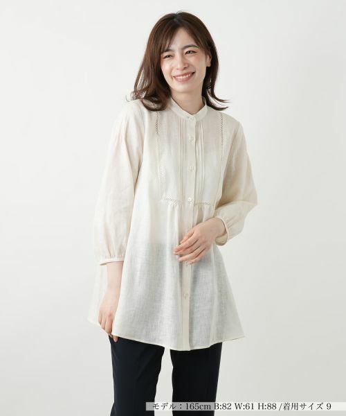 ほんのりと透ける涼やかさが心地よい、ナチュラルな麻素材のバンドカラーブラウス。フロントには繊細なピンタックとハシゴレースをあしらい、さりげなく凛とした表情に。背面はギャザーでふんわりとした丸みを描き、優しいニュアンスを添えています。肩の力を抜きつつも、どこか品よく決まるトップスです。これからの暑い季節にもさらっとまとえて、旬のスタイルに彩りと軽やかさをもたらします。