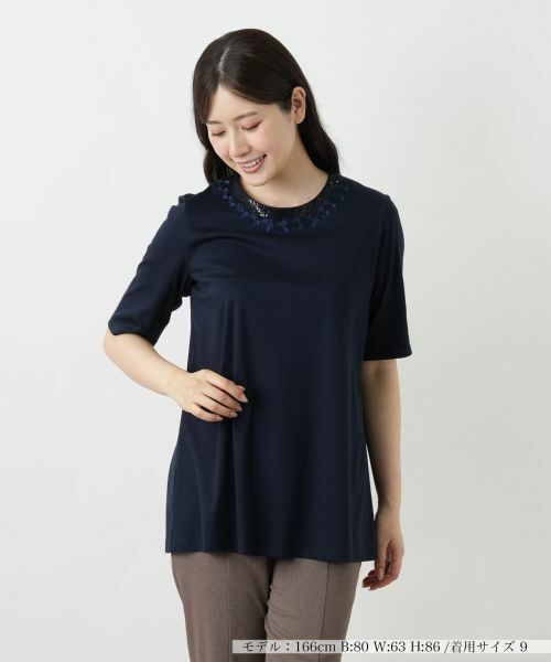 首元にあしらったフラワーモチーフの刺繍とスパンコールが、控えめながらも華やぎを添えるカットソー。柔らかなコットン仕立てで、肌なじみのよい心地よさを叶えながら、リラックス感ときちんと感が共存した佇まいに。バックネックにはループボタンで開閉できる涙あきディテールを取り入れ、後ろ姿にもさりげないアクセントを加えました。デニムにもスカートにも合わせやすく、一枚で着映える注目度の高いアイテムです。