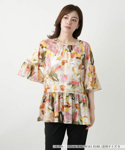 水彩タッチのボタニカル柄が、まるで絵画のように広がるブラウス。軽やかな薄手のコットン素材が空気をふくみ、フレアスリーブや裾のペプラムがふんわりと揺れて、華やかなのにどこかやさしい印象を演出します。バックネックの涙あきディテールにはボタン付きで、着脱もしやすくアクセントに。カジュアルなパンツルックにも、フェミニンなスカートコーデにも合わせやすく、一枚で着映える主役級のトップスです。