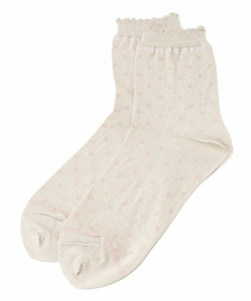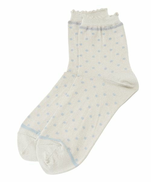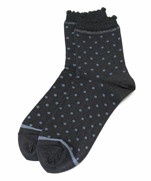 シンプルなドット柄をちりばめたショートソックス。ラメが煌めき、表情にさりげなく変化を生み出しています。履き口周りにはフリルをあしらい、ほんのり甘いエッセンスをプラス。派手になりすぎず程よいリュクス感を演出するデザインは、カジュアルからフェミニンなスタイルまで幅広くマッチ。フラットシューズやローファー、スニーカーと合わせても品よく馴染み、コーディネートをさりげなく格上げしてくれる一足です。