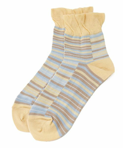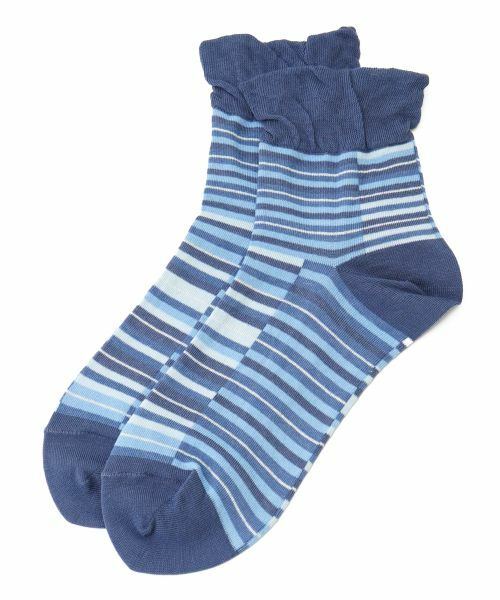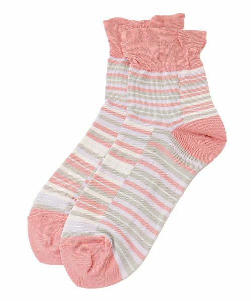 リズミカルに描かれたランダムボーダーが遊び心を加える、ショート丈のソックス。シンプルな装いにもさりげなくアクセントを加え、足元をおしゃれに彩ります。履き口まわりにはフリルをあしらい、ほんのりと甘さをプラス。フェミニンムードを演出しながらも、大人カジュアルにも程よく馴染む絶妙なデザインに仕上げています。パンプスやスニーカー、ローファーなど、多彩なシューズと相性がよく、使い勝手も抜群。