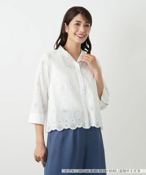 全体に施された繊細なカットワーク刺繍が、涼やかで上品なムードを演出するコットンブラウス。デコルテをきれいに見せるワイドなオープンカラーが、顔周りに開放的な抜け感をプラスします。裾は刺繍に合わせたスカラップカットで仕上げており、細部までこだわりを感じさせる一枚。程よい透け感があり、インナーとのレイヤードはもちろん、夏の軽い羽織りとしても最適です。