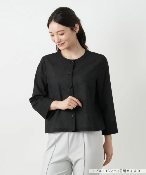 凹凸のある独特な風合いのコットン生地が、肌に心地よいブラウス。首元をシャープに見せる端正なフォルムのネックラインが大人の女性らしい上品な佇まいを演出。袖口にはスリット入れ、程よい抜け感を作り出しています。デザイン性の高いボタンも、さりげないこだわりを感じさせるポイント。フロントを閉めて一枚で着るのはもちろん、夏の軽い羽織りとしても活躍する、着回し力抜群のアイテムです。