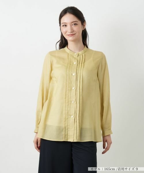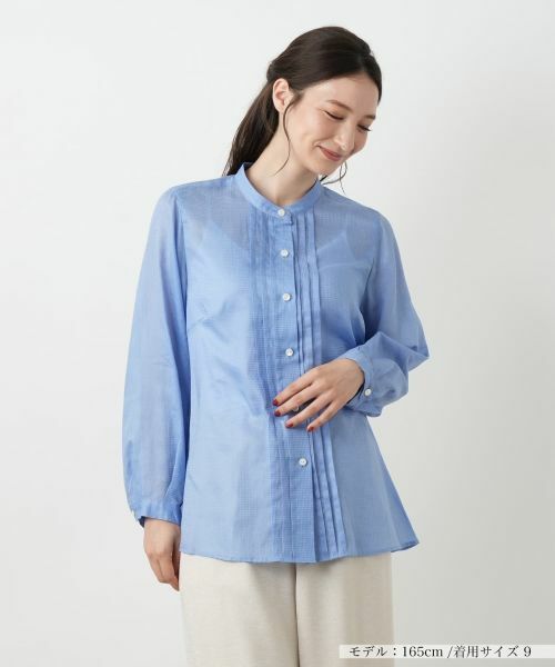 コットンに麻をブレンドした、ナチュラルで清涼感溢れる生地で仕立てたスタンドカラーブラウス。胸元に施された繊細なピンタックが縦ラインを強調し、すっきりとした上品な印象を与えます。シャリ感と薄手でほんのり透ける生地が、見た目にも着心地にも涼やかさをプラス。顔周りをシャープに見せるスタンドカラーもポイントです。一枚でさらりと着るのはもちろん、夏の冷房対策として軽く羽織るのもおすすめ。オンオフ問わずに活躍する、夏のワードローブに加えたいトップスです。