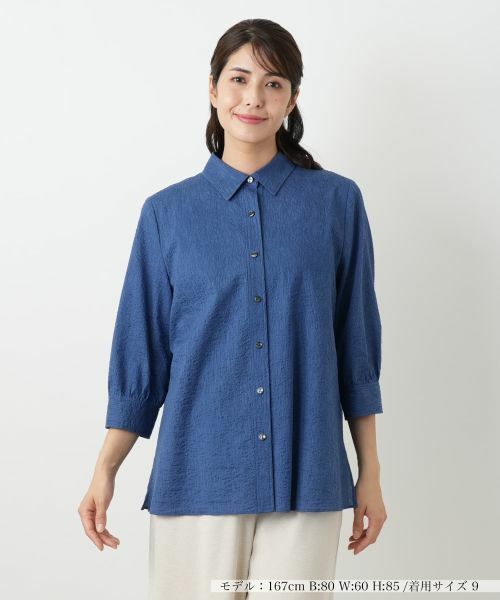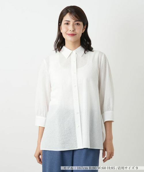 凹凸のある独特なシワ感がナチュラルな雰囲気を醸し出す、コットン仕立てのブラウスです。肌離れのよいやや薄手の生地は伸縮性もあり、ストレスフリーな着心地を叶えます。涼しげな透け感があり、見た目にも軽やか。ヒップまで隠れる長めの着丈と七分袖が、気になる部分をカバーしつつ、裾のスリットが抜け感を演出。一枚で着るのはもちろん、夏の冷房対策の羽織りとしても活躍するリラクシーなアイテムです。