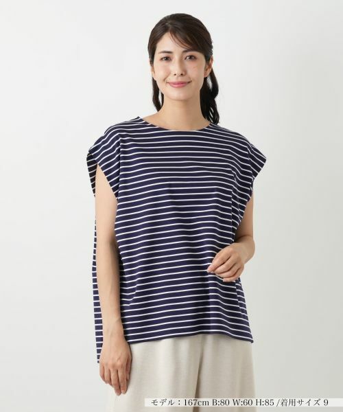 着回し力に優れたシンプルなボーダー柄のノースリーブカットソーです。肌触りの良いコットン素材を使用し、伸縮性もあるため快適な着心地を実感できます。やや薄手の生地ながら透け感はなく、一枚で安心して着用可能。肩先が隠れるデザインとゆったりとしたビッグシルエットが、気になる肩回りやボディラインをさりげなくカバー。サイドに施されたスリットが、コーディネートに抜け感をプラスします。多彩なボトムスとも合わせやすく、夏のデイリーウェアとして活躍間違いなしのアイテムです。