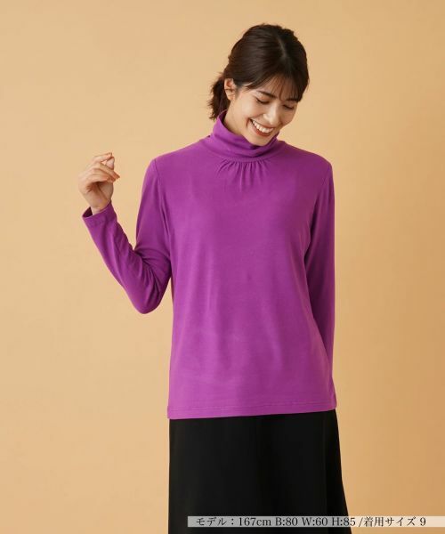 スタイリッシュな雰囲気で着こなせるハイネックカットソー。ネック周りにはギャザーを施し、柔らかなニュアンスに。心地よくフィットするすっきりとしたシルエットながら、生地には適度な伸縮性をもたせているので、ストレスフリーの着心地を実感できます。無駄な装飾を省いたシンプルなデザインでボトムスともコーディネートしやすい一枚。