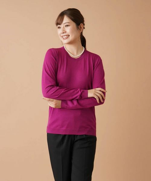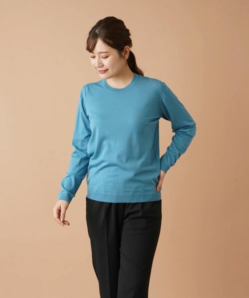 すっきり詰まったクルーネックが落ち着いた印象を与える、シンプルな長袖ニットプルオーバー。ネック周りの編地をさりげなく切り替え、表情に変化をもたせています。上質なハイゲージニットの優しい肌触りが感じられるトップスは、オンにもオフにもフレキシブルに活躍してくれそうです。細身のパンツでまとめるのはもちろん、フェミニンなスカートとのコーディネートも好相性。