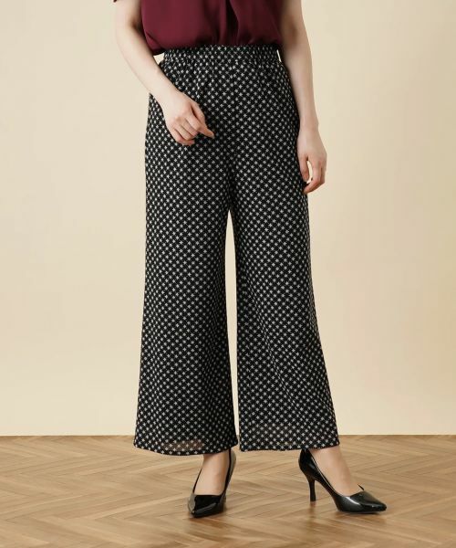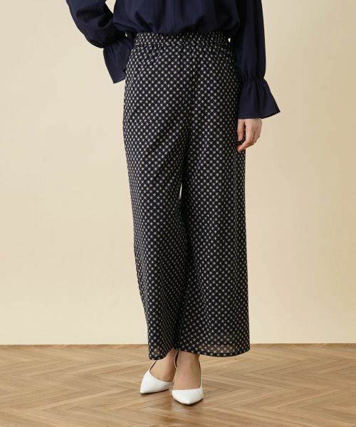 ボタニカル調の幾何学柄をプリントしたワイドパンツ。シンプルなトップスに合わせるだけで、コーディネートの主役として活躍してくれそうな存在感抜群のアイテムです。ウエストは総ゴム仕様で心地よいフィット感をもたせました。肌触りのよい薄手の素材を使用しているので適度な落ち感があり、ストレスフリーな穿き心地を実感して頂けます。