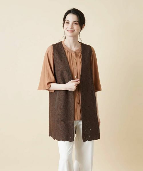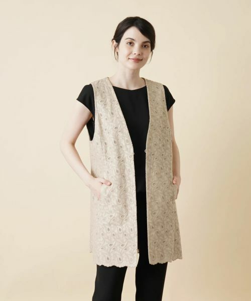 オリエンタル調のペイズリー柄を手の込んだ刺繍で表現した、コットンレース仕立てのロングベスト。これからの季節らしいさらりとした風合いの生地を使用しており、すっきりとしたIラインシルエットがスマートかつエレガントな着こなしを後押しします。シンプルなカットソーにレイヤードするだけで技アリのスタイリングが完成。ヒップまで隠れる丈感なので体型カバーもお手のものです。