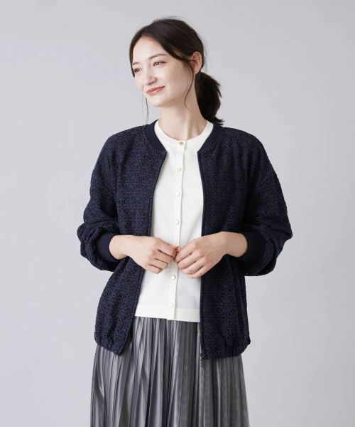 コットン×ナイロンのレースで仕立てた、ロングシーズン楽しめる爽やかな着心地のブルゾン。ジオメトリック柄のような甘さ控えめのレースが大人のデイリースタイルにもマッチします。袖口はゴム仕様とし、心地よいフィット感をもたせました。フロントはファスナーにより手軽に着脱が可能です。フェミニンなスカートやワイドパンツを合わせるだけで、キレイめの大人カジュアルスタイルを演出してくれるアウターです。