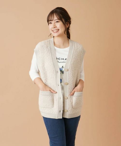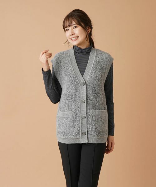 温かみのあるポコポコとした表面感のブークレニットがシーズンムードを醸し出す、Vネックニットベスト。程よくゆとりをもたせたシルエットだから、中に厚手のアイテムを差し込んでもOK。マットなテイストのボタンがさりげないアクセントに。左右のウエストにはシンプルなスクエアポケットをレイアウトしています。季節の変わり目のちょっとしたアウターとしても活躍してくれそうです。